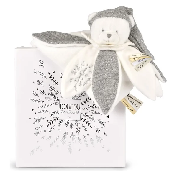 Doudou Coffret Cadeau Peluche câlin ours avec bonnet 25 cm gris