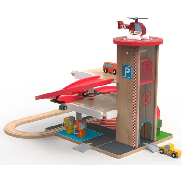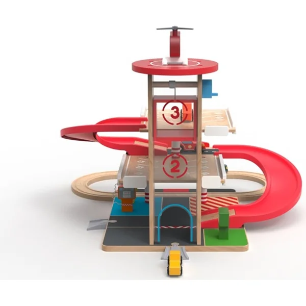 Tous les passionnés d’automobiles auront les yeux qui brillent en voyant ce garage coloré avec ascenseur et héliport. Faites le plein de manière écologique à la station du rez-de-chaussée. Faites monter votre véhicule à l’aide de l’ascenseur à manivelle et regardez-le dévaler la rampe et continuer sur la piste. Un accident s’est produit ? Un hélicoptère décolle déjà de l’héliport sur le toit. Ce jouet éducatif motive les enfants à jouer de manière créative et imaginative. Il développe la coordination main-œil, la motricité fine et l’habileté. Le garage avec des places de stationnement sur trois niveaux comprend également 4 petites voitures et un hélicoptère.