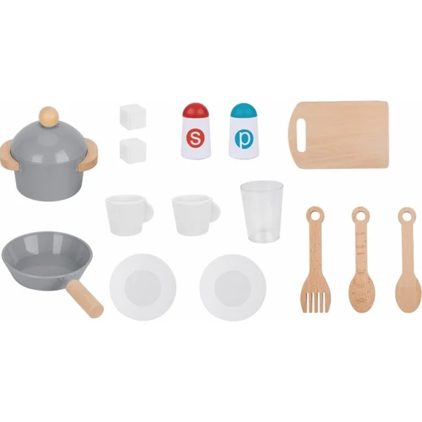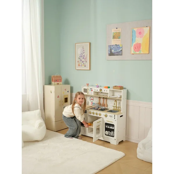 La grande cuisine est le jouet idéal pour tous les enfants qui adorent cuisiner. Elle offre une excellente possibilité de développer la créativité, l’autonomie et de perfectionner les compétences culinaires. La cuisine a un look moderne dans une combinaison stylée de couleur grise et d’accessoires dorés avec tous les appareils nécessaires, la vaisselle importante et les ustensiles. Elle est équipée d’une plaque de cuisson avec des plaques rouges lumineuses (pouvant être allumées et éteintes), d’un four à pâtisserie et d’un micro-ondes, d’une machine à café, d’un réfrigérateur avec un fabricant de glace avec 2 cubes de glace, d’un lave-vaisselle et d’un évier. Pour préparer les plats, les petits chefs utiliseront une casserole avec un couvercle, une poêle, une planche à découper, des cuillères en bois et une spatule. Pour le service, des assiettes, des tasses, des verres sont disponibles, sans oublier le salier et le poivrier.