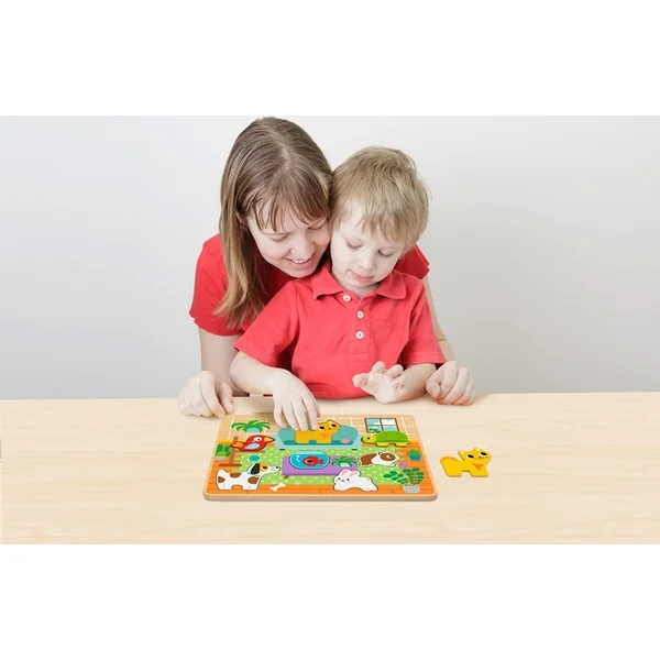 Quelle belle journée paisible. Allons jouer avec nos petits amis. Ce puzzle à encastrement offre une excellente opportunité d’entraîner la motricité fine, la patience et la découverte des animaux chez nos plus petits. Il se compose d’une base et de 7 pièces amovibles. Le jouet est fabriqué en bois de qualité FSC. Il possède de belles illustrations, ce qui en fait également une jolie décoration dans la chambre d’enfant.