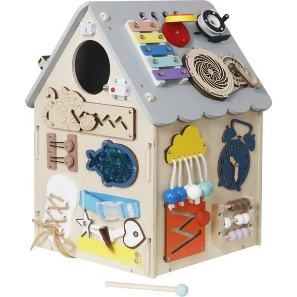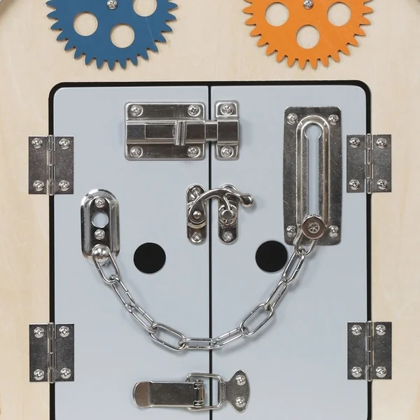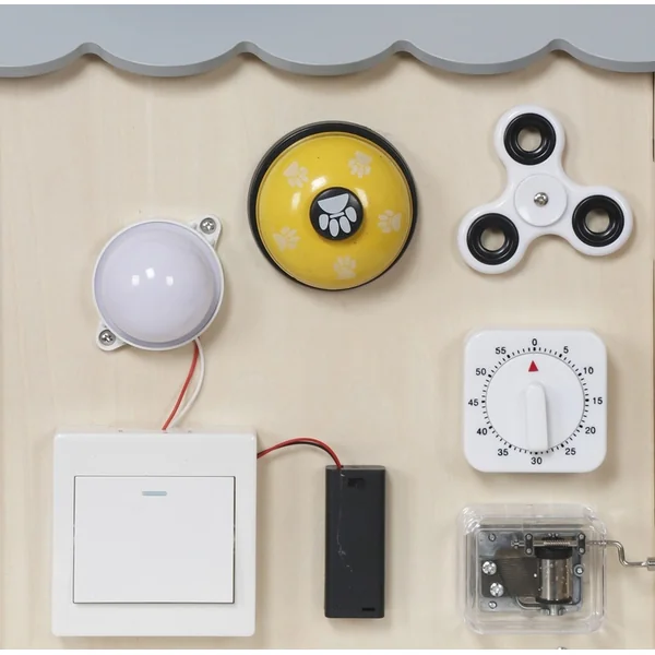 Les enfants y trouveront différents types de serrures, de loquets et de crochets qui, une fois déverrouillés, révèlent des portes mystérieuses, un spinner à faire tourner, un minuteur rotatif, des interrupteurs, ou encore un labyrinthe coloré avec un petit poisson. Le xylophone avec une baguette initie les enfants aux premiers sons et rythmes. Il y a aussi une horloge pour apprendre à lire l’heure et d’autres activités qui stimulent les sens et favorisent la pensée logique.