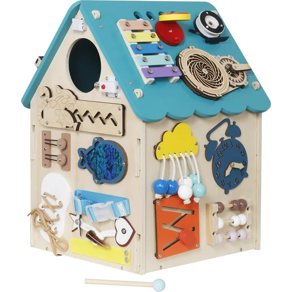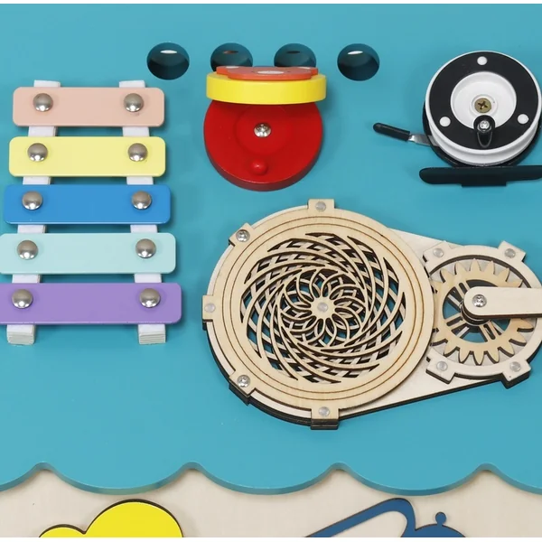 Les enfants y trouveront différents types de serrures, de loquets et de crochets qui, une fois déverrouillés, révèlent des portes mystérieuses, un spinner à faire tourner, un minuteur rotatif, des interrupteurs, ou encore un labyrinthe coloré avec un petit poisson. Le xylophone avec une baguette initie les enfants aux premiers sons et rythmes. Il y a aussi une horloge pour apprendre à lire l’heure et d’autres activités qui stimulent les sens et favorisent la pensée logique.