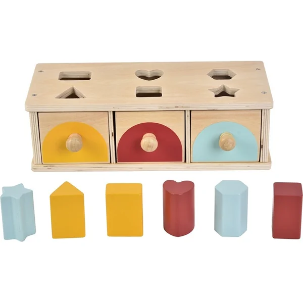 Les enfants insèrent des formes dans des ouvertures selon leur couleur et leur forme. Chacun des trois tiroirs a deux ouvertures au-dessus et est coloré à l’avant. Si la forme insérée est correctement triée, elle glisse dans le tiroir correspondant. L’enfant voit immédiatement le résultat de sa tentative, ce qui développe la compréhension du principe de cause à effet.