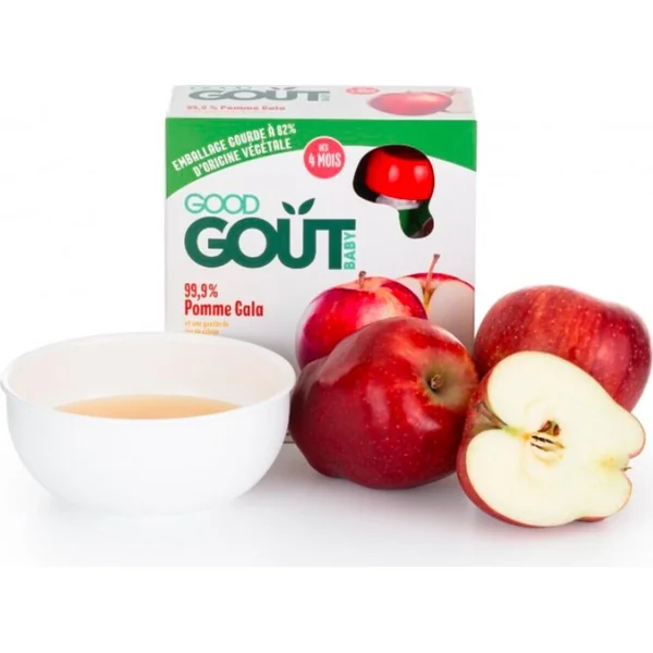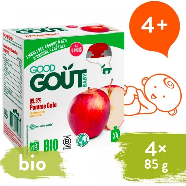 Alimentation infantile à partir de 4 mois. Purée de fruits pour une alimentation spéciale des nourrissons et des jeunes enfants. Pasteurisé. Cuit. Sans gluten. Cet emballage contient Good Gout BIO Pomme (4×85 g)