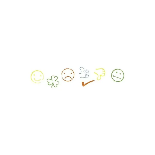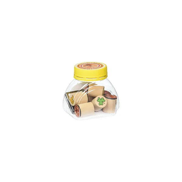 7 mini tampons en bois et caoutchouc avec des motifs différents : super content, sourire, moyennement content, des mains avec le pouce vers le haut et vers le bas, un tampon validé et un tampon trèfle.