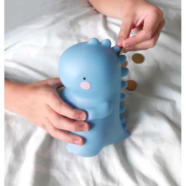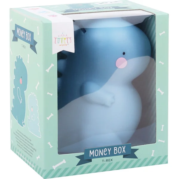 Une tirelire pour enfants en forme de dinosaure T-rex. La tirelire a une fente en haut pour les pièces et les billets, et un couvercle à vis au bas pour retirer facilement l’argent stocké. La tirelire peut également servir de belle décoration dans la chambre d’enfant ou la salle de jeux.