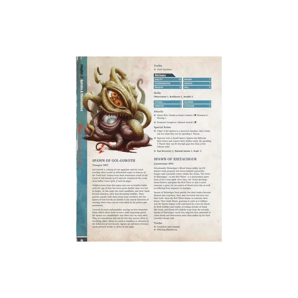 La section Horrors and Monstrosities offre une sélection de créatures capables de menacer à la fois le corps et l’esprit : des entités classiques du Mythe comme les Dholes ou les Araignées de Leng, jusqu’à des créations inédites telles que le Rôdeur des Sables ou la Graine enflammée de Kol’Valassam. Le livre se conclut par une galerie d’êtres divins et indicibles — Dieux Extérieurs, Grands Anciens et Dieux Primordiaux — destinés à inspirer la peur jusque dans les cœurs les plus endurcis.
