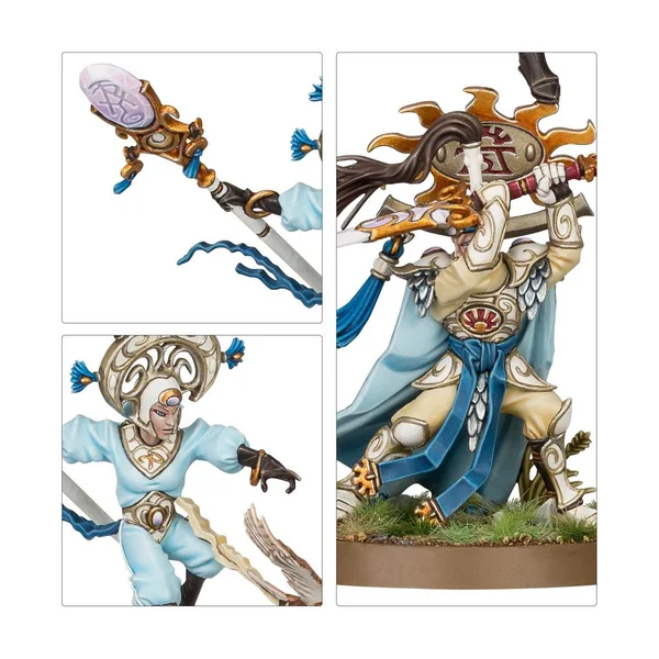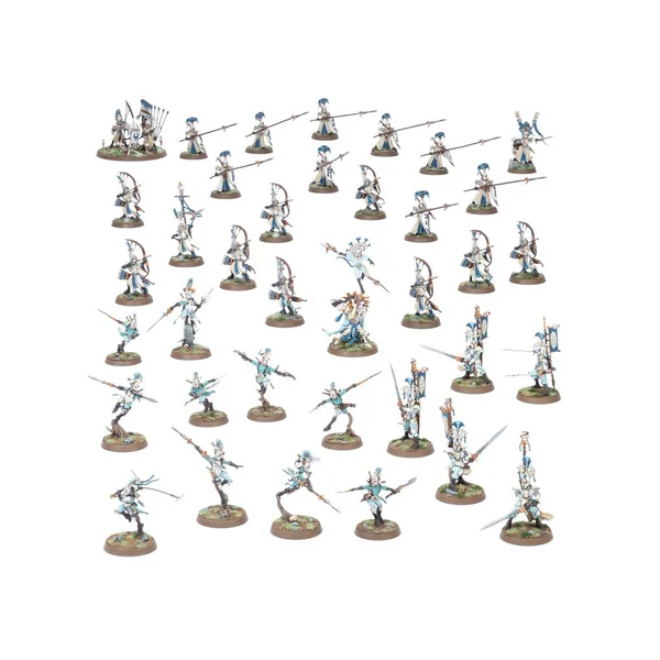 Les osts de guerre des Suzerains Lumineths sont naturellement habiles, bien équipés et très disciplinés. Quand ils se rassemblent en force de combat, ils prennent soin de trouver l’équilibre entre attaque, défense, rapidité et puissance. Les divers éléments de l’armée se soutiennent mutuellement pour y trouver une efficacité supérieure à la somme de ses composants. Cette boîte pleine à craquer est idéale pour entamer une nouvelle collection de Suzerains Lumineths ou pour étoffer une armée existante afin de purifier les Royaumes Mortels dans les parties de Warhammer Age of Sigmar. Elle vous permettra en outre de faire des économies par rapport à un achat des kits au détail. Cette force conséquente et équilibrée est menée par Ellania et Ellathor, les légendaires Sages de Guerre Éclipsiens qui apportent leur puissance magique et leurs prouesses martiales au contingent. Le noyau de cette armée est composé de Sentinelles et de Gardes Auraliens Vanari qui fournissent appui à distance et défense inamovible. Ces formations sont soutenues par une unité de Lames Ydriliennes aussi rapides qu’insaisissables pour capturer les objectifs cruciaux en territoire ennemi. Une unité de Maîtres des Lames Vanari est parée à s’attaquer aux unités ennemies les plus résistantes, tandis qu’une Baliste Astrécharde Vanari élimine à distance les cibles importantes.