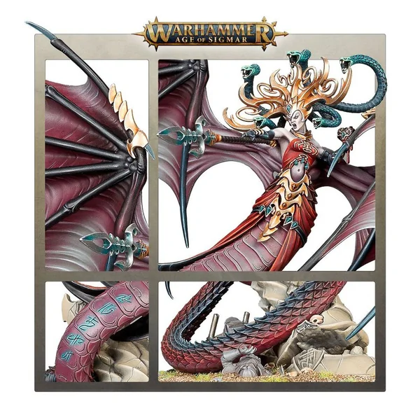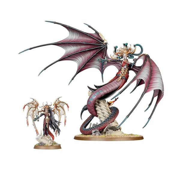 La Shadow Queen est une tout autre histoire – elle est presque trois fois plus haute avec une posture autrement plus agressive, ce qui en fait une splendide pièce centrale pour n’importe quel collectionneur de Daughters of Khaine. Sous cette forme, c’est son furieux aspect serpentin qui prédomine, car tout le bas de son corps est ophidien et enroule ses anneaux autour d’un épais pilier de pierre. Le haut du corps porte la même armure et la même coiffe tout en brandissant Écorche-cœur – mais sa chevelure est ici faite de serpents, et les ailes ont grandi démesurément sous une forme écailleuse, munie de pointes chitineuses promptes à empaler les imprudents. Le socle comporte une victime aelfe pétrifiée et cassée en deux par le regard de Morathi.