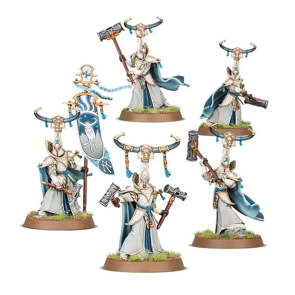 Ce kit permet d’assembler 5 Alarith Stoneguards, les options pour monter un porte-étendard et un Truestone Seneschal. Chaque Alarith Stoneguard peut être armé au choix d’un maillet de pierre ou d’un pic de diamant, tandis que le Truestone Seneschal peut manier une paire de marteaux à strates. Le tout est fourni en 63 composants plastique, plus 5 socles ronds de 32mm.