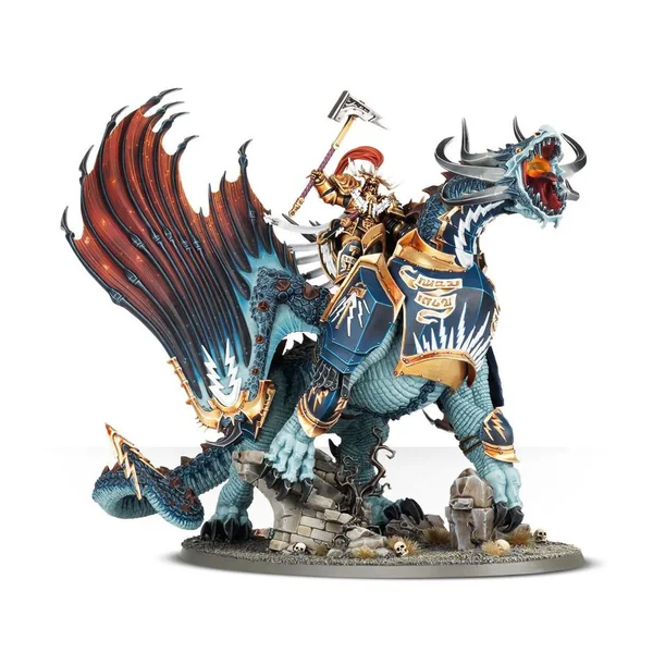 - un Lord-Celestant sur Stardrake, chef de son Extremis Chamber, qui commande à la puissance des étoiles elles-mêmes, il peut avoir soit un marteau Tempestos, soit une lame fulgorée et un bouclier de sigmarite.