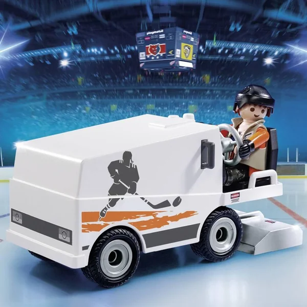 La surfaceuse est passée, le match peut commencer ! Un personnage et une surfaceuse pour préparer la surface du stade de hockey (référence 5594) avant le jeu. Le stade s’ouvre sur les cotés pour laisser passer la surfaceuse. La lame de la surfaceuse est mobile. ATTENTION ! Ne convient pas aux enfants de moins de 3 ans : risque d’asphyxie à cause de petits éléments !