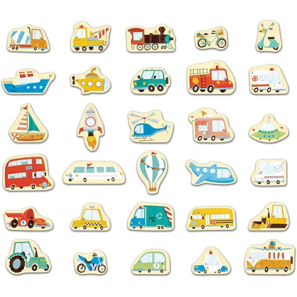Dans les airs, sur terre, sur l’eau… Découvre les différents moyens de transport qui existent en assemblant ces 10-15 puzzles adaptés au développement de l’enfant, suivant leur nombre de pièces (de 2 à 6) et embarque pour un voyage des plus captivants !