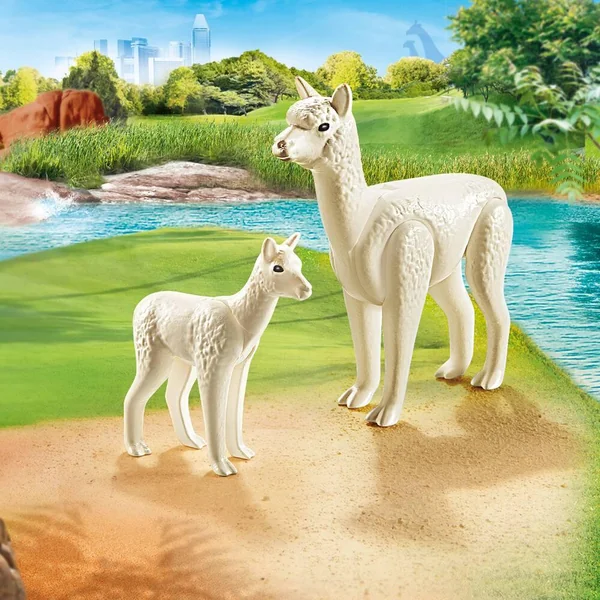 Le parc animalier Playmobil est un lieu que tout le monde adore, les petits comme les grands. On peut y observer une vingtaine d’espèces en semi-liberté, qui mènent chaque jour leur vie de famille avec leurs congénères et les autres espèces avec lesquelles ils cohabitent. Le parc est magnifique et il contribue à la sauvegarde des espèces en garantissant aux animaux un lieu de vie confortable où ils sont nourris, logés et choyés ! Les visiteurs empruntent un chemin bien précis pour visiter le parc afin de ne pas déranger les animaux, mais aussi de rester en sécurité. Ils pourront approcher et caresser les animaux qui n’attendent que ça lors de leur passage au jardin animalier ! Cet alpaga veille sur son bébé. Contient deux alpagas.