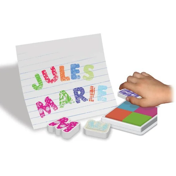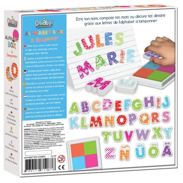 Grâce à ces jolies lettres de l’alphabet l’enfant pourra écrire son nom, composer ses mots et décorer ses dessins de manière originale et créative ! Idéal pour les activités de scrapbooking. Une boite contenant 30 lettres de l’alphabet (dimensions des lettres 30 x 30 mm), 1 encreur 4 couleurs (dimension 70 x 70 mm) orange, bleu, vert et fushia lavable à l’eau.