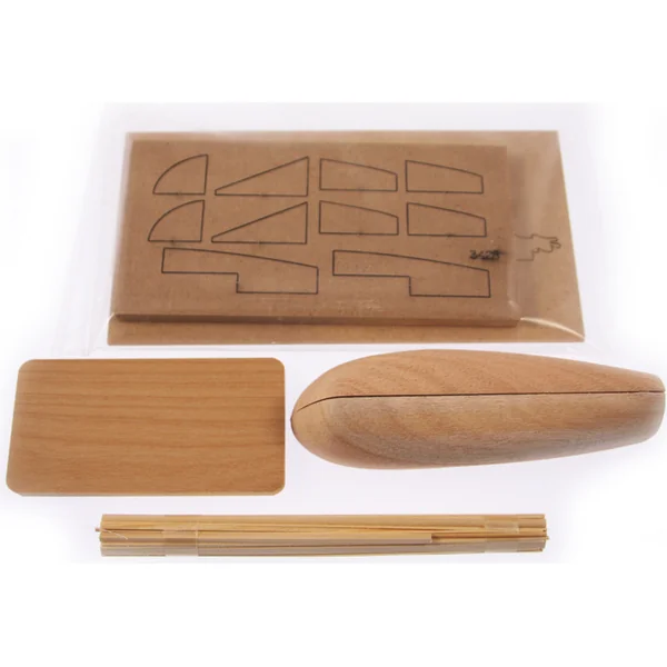 L’emballage contient un corps semi-fini, des pièces en contreplaqué, des lattes en bois, un blister avec de petites pièces, un ensemble de dessins et un manuel en anglais et en italien.