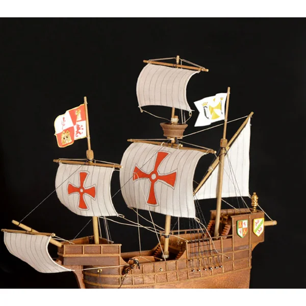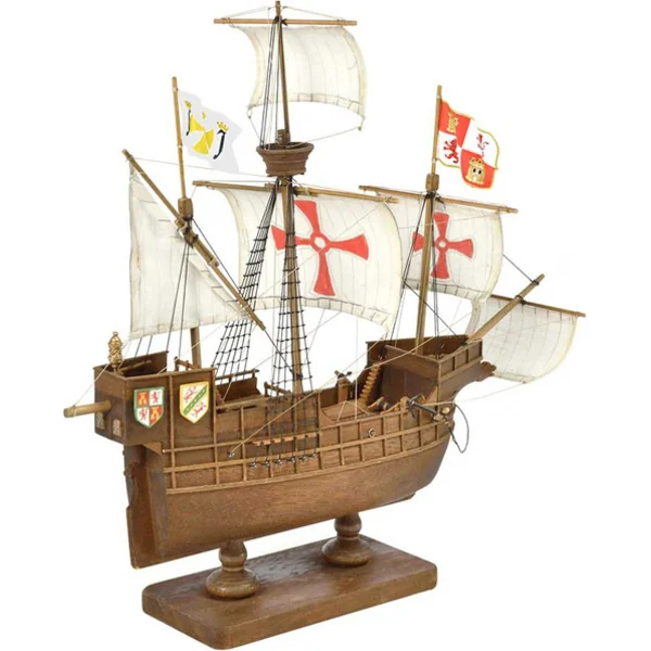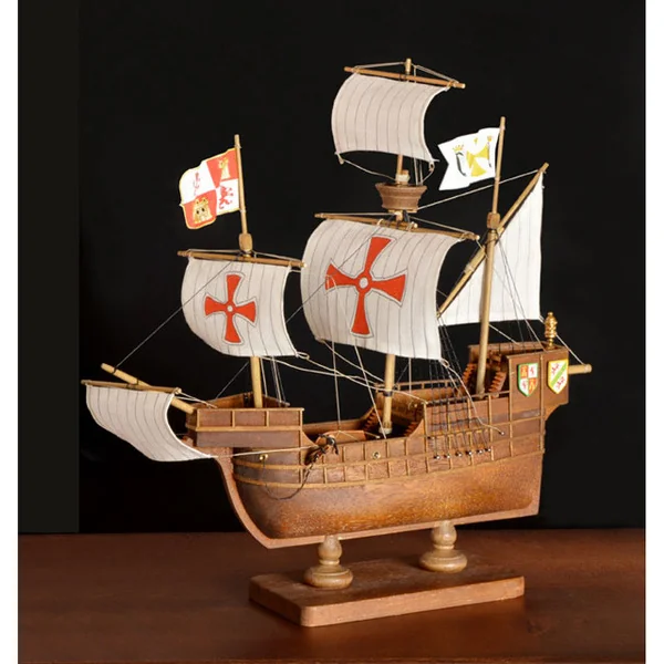 Kit de construction d’un modèle statique de navire historique, AMATI Santa Maria 1:100 First step kit. Les navires historiques sont parmi les modèles de bateaux les plus populaires, c’est pourquoi une série First step kit a été créée, destinée aux débutants. Le kit comprend une coque en bois prête, une quille avec découpes et de petits accessoires. Les voiles ne sont pas incluses dans l’emballage.