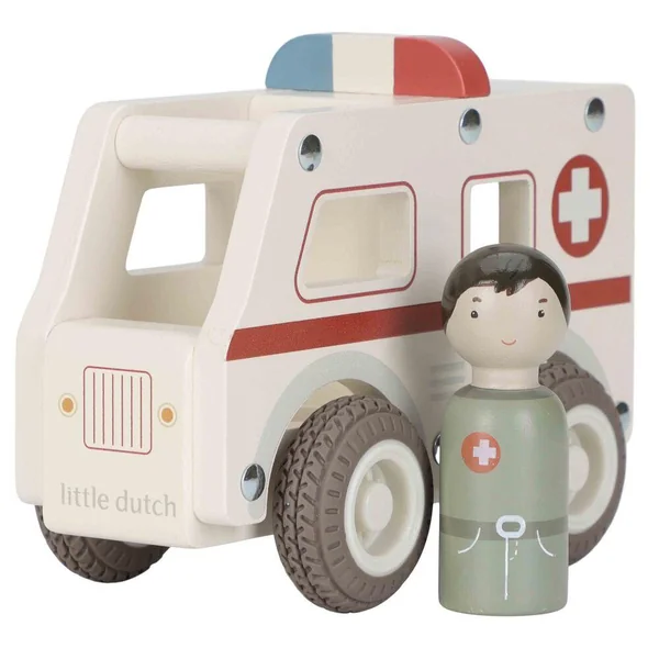 Sirène en marche, l’ambulance arrive ! Cette ambulance en bois, dotée de roues en caoutchouc pour une conduite en douceur, permet de transporter rapidement les patients à l’hôpital. L’intérieur est conçu pour accueillir un patient, et l’ensemble comprend également une figurine d’infirmière en bois.