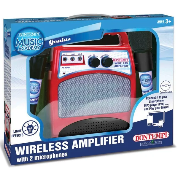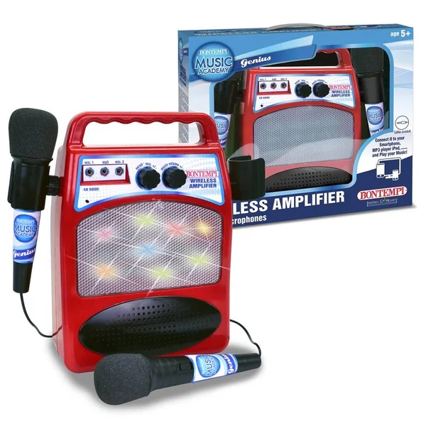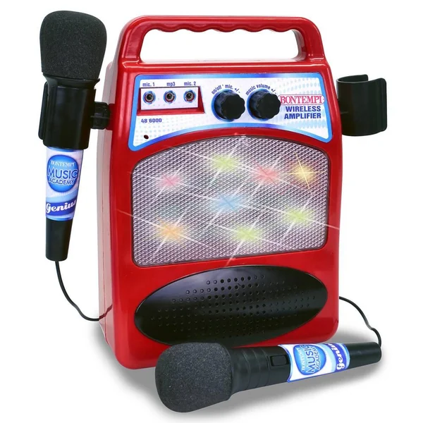 Avec 2 micros avec effet d’écho et contrôle du volume. Connexions Bluetooth et MP3 (MP3 non inclus) avec câble (fourni). Effets lumineux.