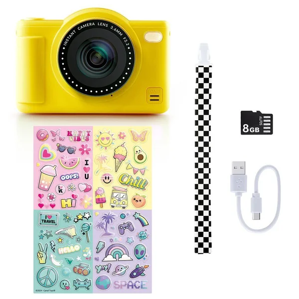 Un mini appareil photo numérique compact jaune avec mémoire intégrée pour prendre des photos et des vidéos !