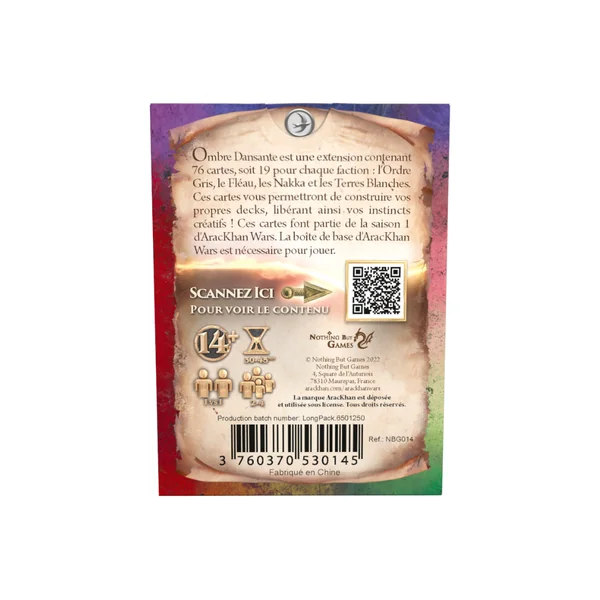 Ombre Dansante est une extension pour le jeu AracKhan Wars contenant 76 cartes, dont pour chacune des 4 factions : l’Ordre Gris, le Fléau, les Nakka et kes Terres Blanches. Ces cartes vous permettront de construire et d’améliorer vos propres decks, libérant ainsi vos instincts créatifs !