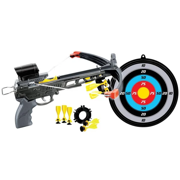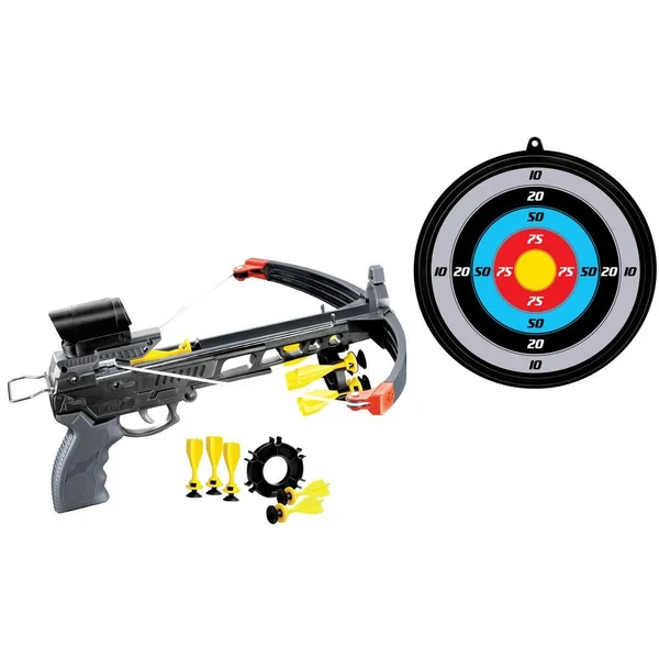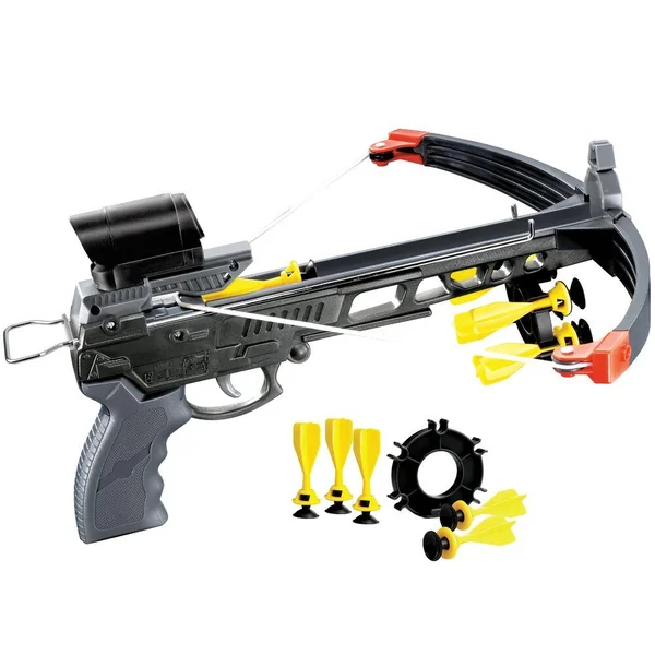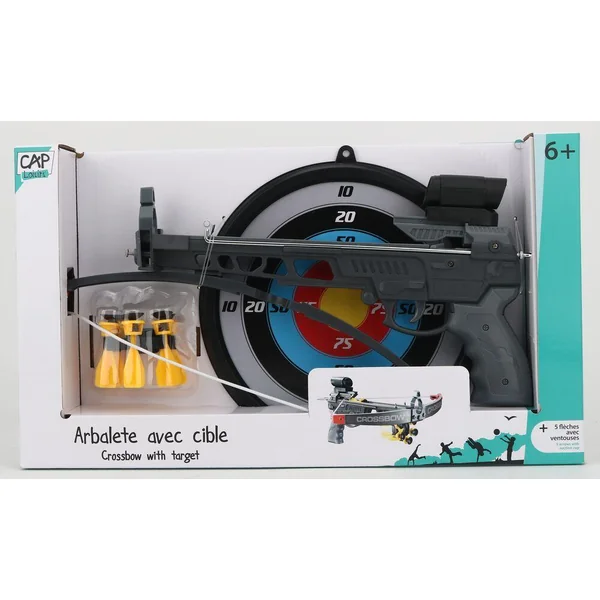 Contient : 1 arbalète longueur 34cm avec viseur factice (sans lentille), 1 cible diamètre 23.4 cm et 5 fléchettes avec ventouses.