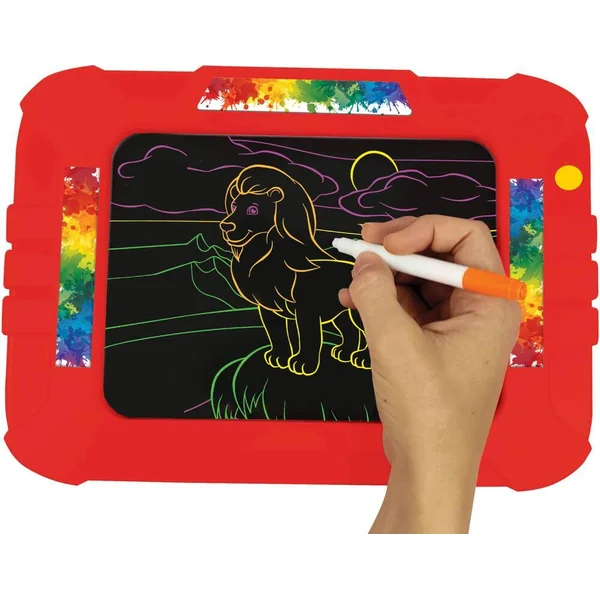 Une super ardoise électronique lumineuse qui éclaire tes dessins avec un effet néon ! Surface acrylique transparente sur laquelle tu peux dessiner ce que tu veux ou suivre les 6 modèles fournis. Appuie simplement sur le bouton pour voir ton œuvre d’art briller de mille feux avec un effet néon ! Choisis parmi les 8 effets de lumière colorés différents ! Regarde ton dessin s’éclairer en fluo de différentes couleurs ou bien clignoter en couleurs alternées ! Lorsque tu as terminé, essuie simplement l’écran pour recommencer ! Chevalet inclus : système à l’arrière te permettant de mettre de l’ardoise comme un chevalet. Avec un chiffon de nettoyage et 2 feutres à double pointe bicolores inclus. Notice incluse. Feutres effaçables. 3 piles LR03 non fournies.