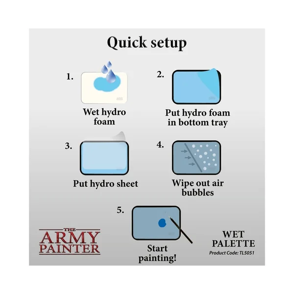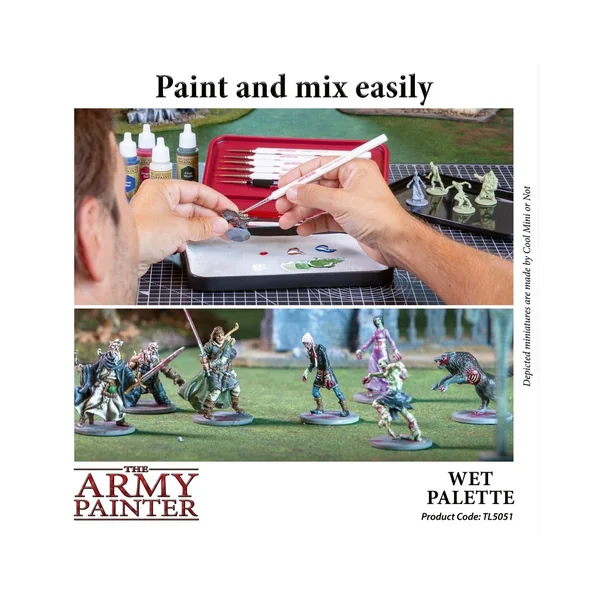 Cette palette humide est conçue sur mesure pour que vos peintures soient parfaitement conservées, lisses et crémeuses ! La Palette humide est livrée avec 2 feuilles d’hydro mousse et 50 feuilles d’hydro. La conception spéciale de la couche intérieure peut contenir jusqu’à 6 pinceaux Wargamer et 10 pinceaux Hobby de la gamme Army Painter.
