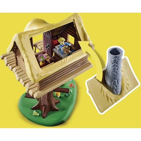 Assurancetourix est le barde du village. Les opinions sur son talent sont partagées. Il trouve qu’il est génial, tous les autres pensent qu’il est innomable. Assurancetourix saisit chaque occasion pour interpréter ses dernières compositions aux villageois. Il reçoit souvent des coups pour ses talents de chanteur, bâillonné ou attaché à l’arbre le plus proche. Il vaut donc mieux rester dans sa hutte dans les arbres. Pendant qu’Assurancetourix pense à de nouvelles mélodies à l’étage, Mme Agecanonix s’occupe des poules en bas. Tant qu’il ne parle pas, et encore moins chante, tout le monde l’aime. La boite contient le barde Assurancetourix et Mme Agecanonix, la hutte d’Assurancetourix avec son mobilier et le toit amovible, une cornemuse, un violon, une harpe et bien d’autres accessoires pour des aventures passionnantes. Avec la corde incluse, une figurine peut être attachée à une branche.
