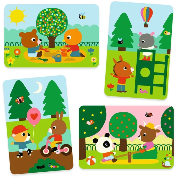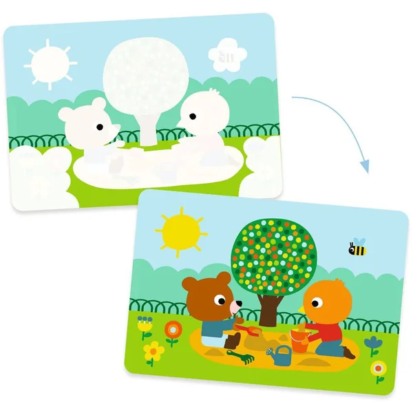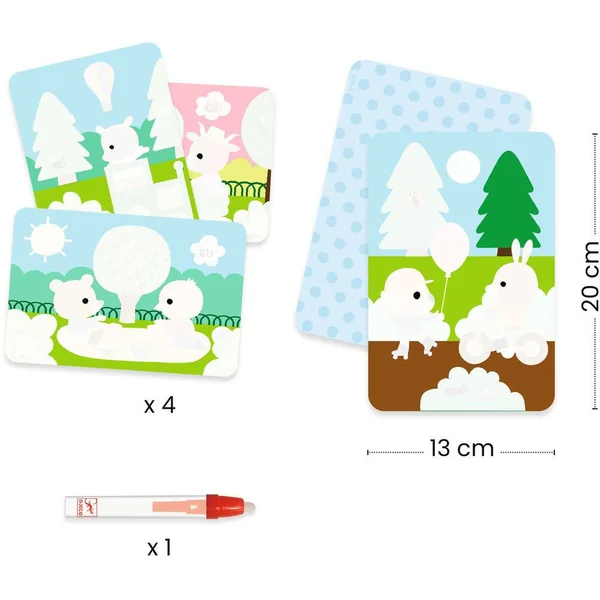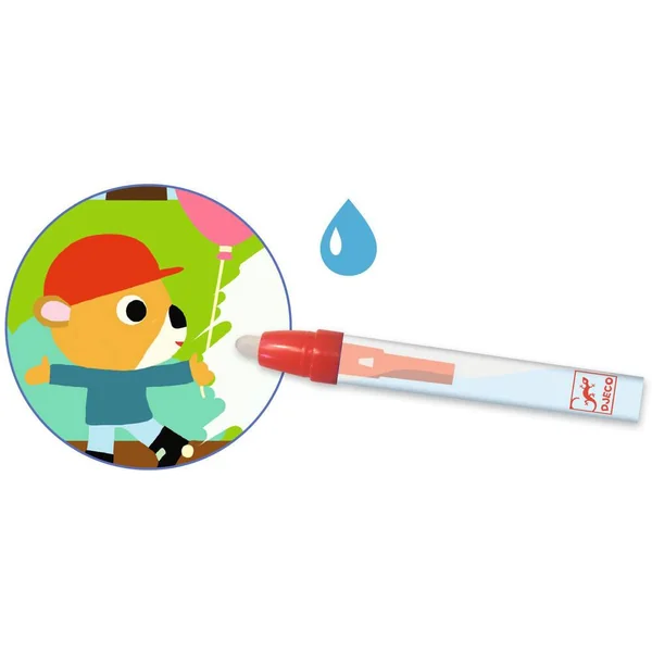 Une pochette de coloriage à l’eau adaptée pour les enfants, dès 18 mois. L’enfant colorie à l’aide du crayon à eau les parties blanches pour découvrir ce qui se cache derrière. C’est magique : des motifs apparaissent et changent de couleurs ! Les planches sèchent et l’enfant recommence !