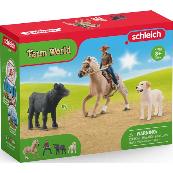 - Le set comprend : 1× cowboy, 1× Quarter Horse, 1× bride et rênes, 1× selle western, 1× chienne labrador, 1× veau de race Black Angus.