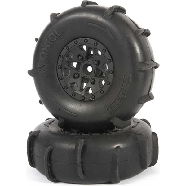 Pièce de rechange pour modèles réduits de voitures RC Axial Yeti Jr.™ Can-Am® Maverick 1:18 : roues avant avec pneus ST28 Razor et roues arrière avec pneus Paddle, pour le sable et les terrains meubles, porte-roue 12 mm.