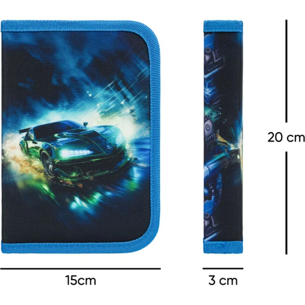 • Trousse classique à 2 rabats avec un motif de voiture de course sur le devant.