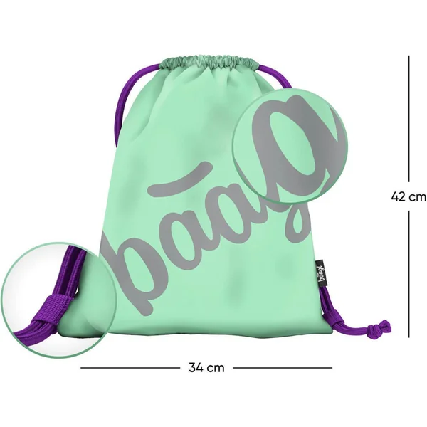 Sac à chaussures en couleur menthe avec le logo Baagl, qui brille dans l’obscurité, fermeture par des cordons solides qui permettent également de porter le sac sur le dos.