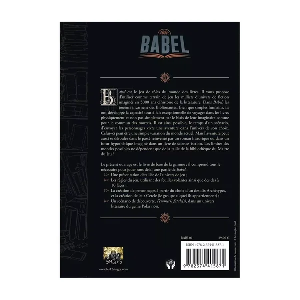 Babel est le jeu de rôles du monde des livres. Il vous propose d’utiliser comme terrain de jeu les milliers d’univers de fiction imaginés en 5000 ans d’histoire de la littérature. Dans Babel, les joueurs incarnent des Biblionautes. Bien que simples humains, ils ont développé la capacité tout à fait exceptionnelle de voyager dans les livres physiquement et non pas simplement par le biais de leur imaginaire comme pour le commun des mortels. Il est ainsi possible, le temps d’un scénario, d’envoyer les personnages vivre une aventure dans l’univers de son choix.