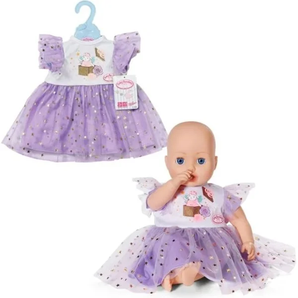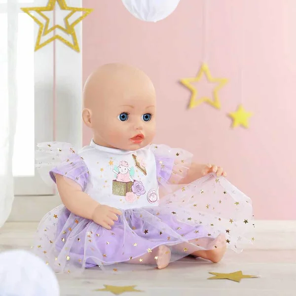 Avec cette robe sucrée, Baby Annabell peut réveiller son côté ludique : La robe violette a du tulle en bas et des applications d’étoiles dorées. En haut, il y a un mignon petit mouton avec une baguette magique qui émerge d’une boîte dorée scintillante. Un excellent vêtement pour les poupées Annabell qui ne devrait manquer dans la garde-robe d’aucune poupée !