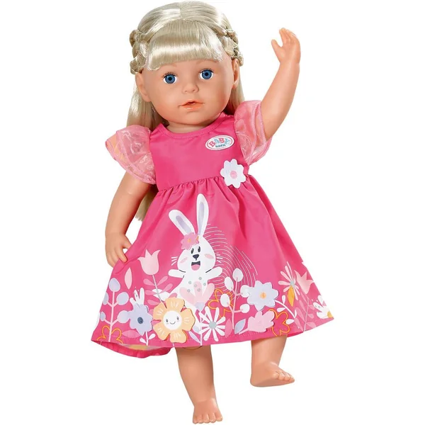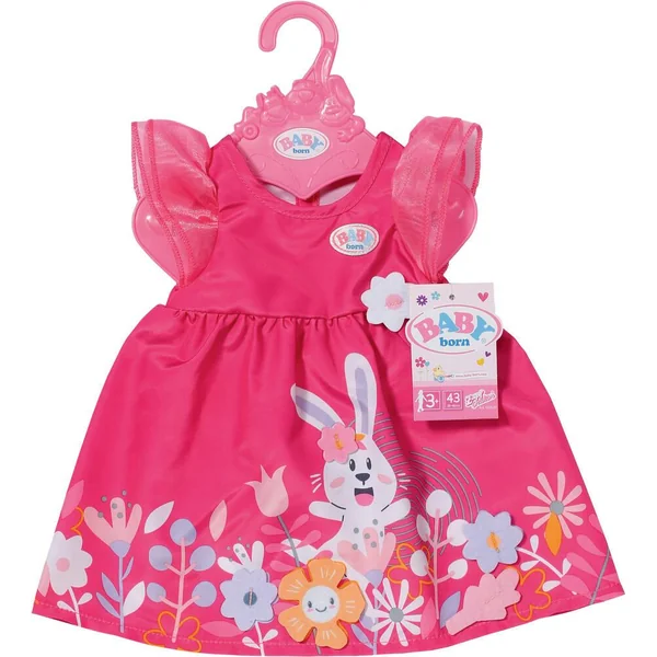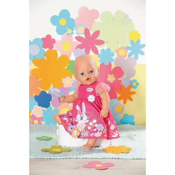 Comme BABY born, Bine le lapin sautille aussi dans la prairie sur la robe rose. Certaines des fleurs, et la fleur sur la transition entre le haut et la jupe, sont des appliqués 3D. Les jolies manches sont en tulle rose et rappellent des pétales délicats.