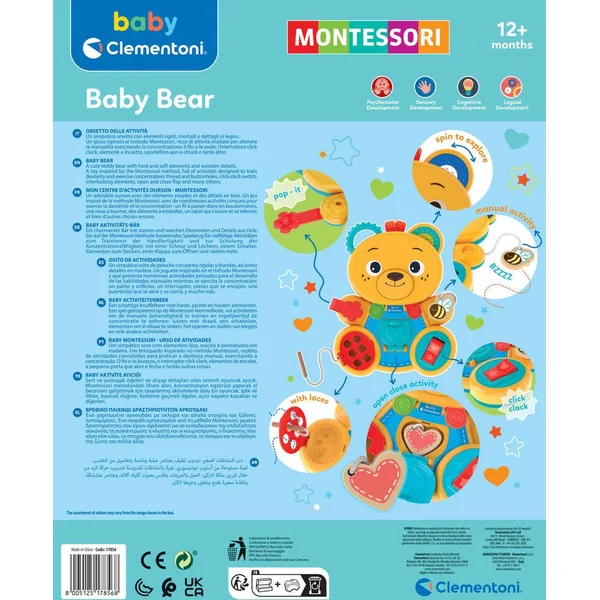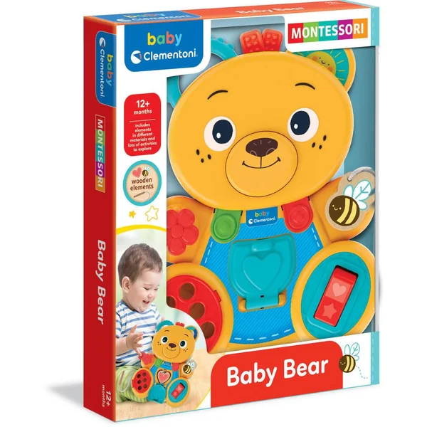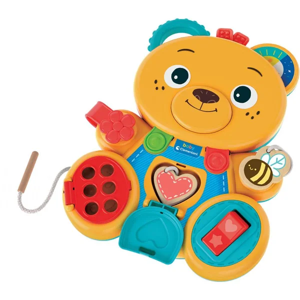 Un amusant ourson avec des éléments faits de différents matériaux et de nombreuses activités à explorer. Un jeu inspiré de la méthode Montessori, plein de mécanismes et d’activités conçues pour perfectionner les compétences manuelles de l’enfant et améliorer sa concentration. Grâce aux différents matériaux du jouet, l’ourson stimule les capacités sensorielles, guidant l’enfant dans son apprentissage du maniement des objets du quotidien. Un jeu Montessori classique (Busy Board), revisité avec le design unique et amusant de Baby Clementoni.