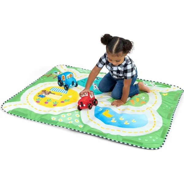 Pour les plus grands, le tapis se déplie en un chemin de jeu sur lequel ils peuvent faire rouler des voitures jouets comme lors d’une excursion à la ferme !
