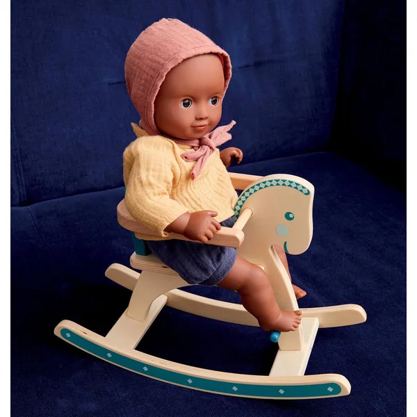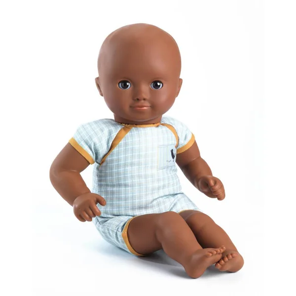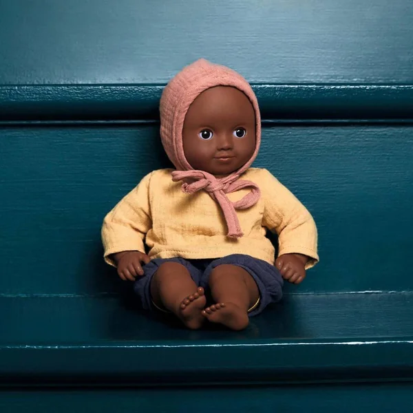 Avec ses beaux yeux noirs et sa tenue assortie, Baby Mimosa est une poupée pour les enfants dès 18 mois. Elle est légère et sa taille (32 cm) est parfaitement adaptée aux petits bras. Son corps souple est imprimé d’un joli « body »et permet de la positionner comme un vrai bébé. Son visage, ses bras et ses jambes sont en vinyle très doux, agréable au toucher. Avec ses yeux dormeurs, elle s’endort quand on la couche sur le dos. Ce poupon est habillé d’un bloomer, d’une chemise et d’un béguin en double Gaze 100 % coton.