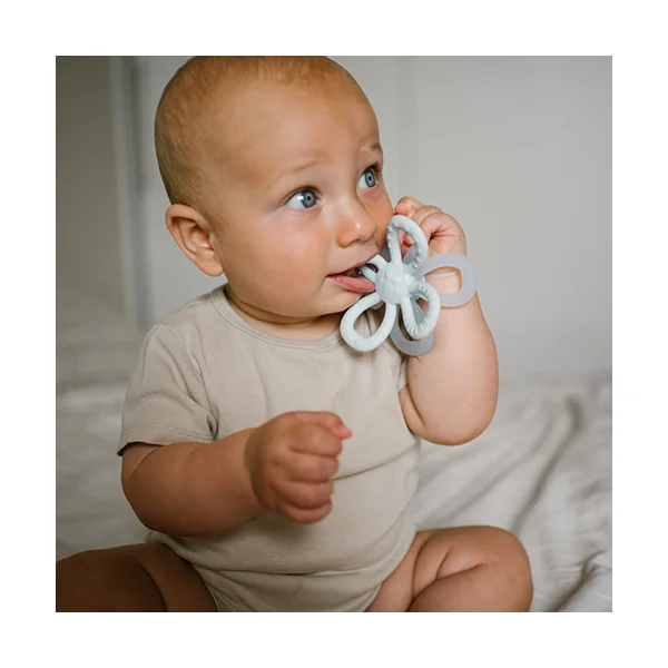 Le nombre de fonctions que le hochet en forme de fleur possède aide l’enfant pendant la période difficile de la poussée dentaire.