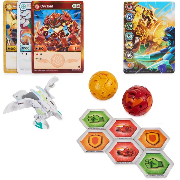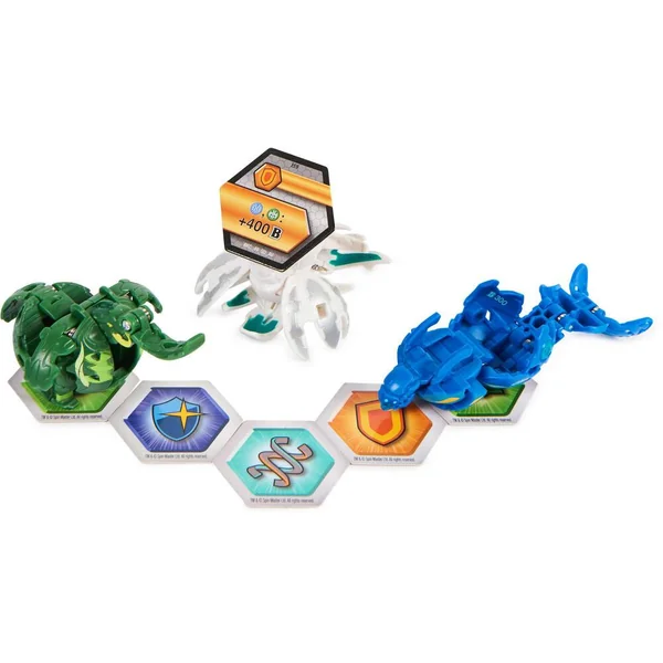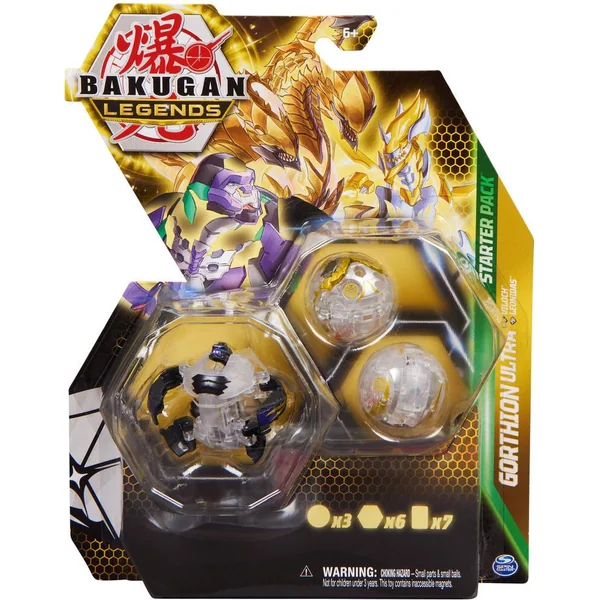 Un coffret de démarrage contenant tout le nécessaire pour constituer son équipe de 3 billes et se lancer directement dans le combat : 2 Bakugan classiques + 1 Bakugan Ultra avec transformation spéciale, 6 tuiles BakuCore, 3 cartes Personnage, 3 cartes Maîtrise, 1 carte Portail et une règle de combat. Concept unique : à la fois figurine d’action, jeu d’adresse, casse-tête et collectionnable. Mécanisme de transformation magique pour les enfants. Les billes Bakugan se déploient et se transforment en créatures fabuleuses lorsqu’elles sont envoyées correctement sur les cartes aimantées. Chaque Bakugan est aussi un casse-tête miniature : il faut apprendre à maîtriser son mécanisme de fermeture unique. Plusieurs modèles disponibles. Boîte blister, dimensions 20.3 x 6.4 x 25.4 cm.