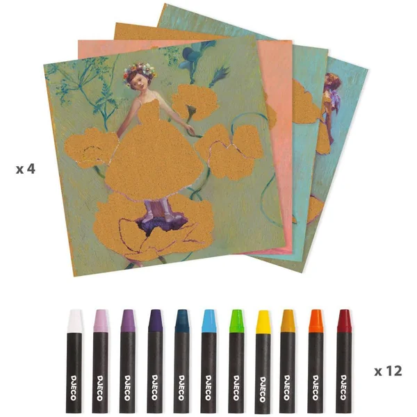Une activité de pastels gras aux illustrations inspirées du style du grand maître impressionniste, Edgar Degas. L’enfant ajoute progressivement les couleurs, les superpose pour créer ombres et lumière dans le pli des étoffes. Les danseuses prennent vie.