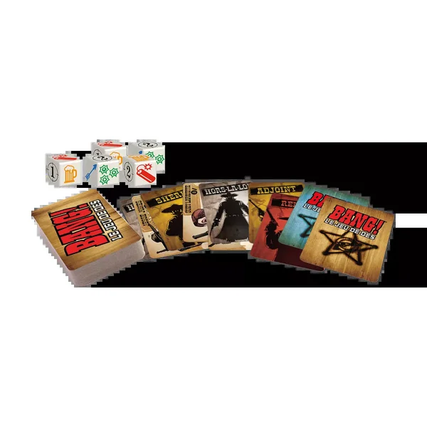 Dans Bang ! Le jeu de dés, la lutte est acharnée entre le shérif, les hors-la-loi et le renégat. Chacun veut éliminer le clan adverse et les balles fusent de partout ! Méfiez-vous des Indiens et de la dynamite, et ne vous trompez pas d’ennemi, car les rôles sont secrets sauf celui du shérif… Et si malgré tous vos efforts, vous êtes à moitié mort, rien de tel qu’une petite mousse pour ne pas finir en bière !