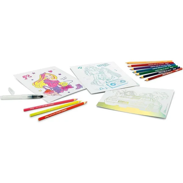 Créez des tableaux métallisés à colorier et sublimez-les avec un pinceau pour obtenir un effet « aquarelle » unique ! Apprenez facilement à réaliser des effets dégradés et des fondus uniques, parfaitement adaptés aux enfants qui adorent l’univers magique de la couleur ! Plongez dans le monde enchanté de Barbie qui captivera à coup sûr vos petits artistes. Le kit contient : – 3 fiches illustrées (métallisées, avec un grain papier dessin , grammage 750 g) – 10 crayons Aqua – 1 pinceau réserve à eau – 1 notice.