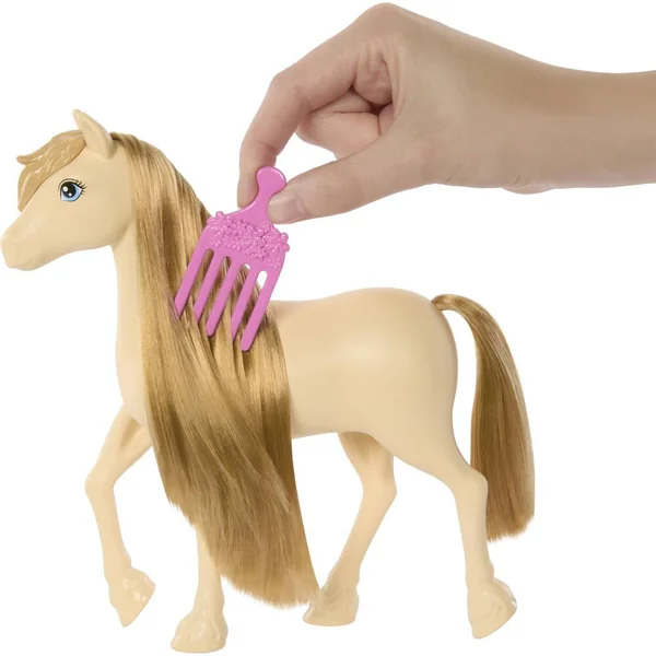 Ce joli palomino haut de 18cm attend d’être coiffé. Sa queue et sa crinière se parent de barrettes ou d’extension bleue. 8 accessoires sont inclus.