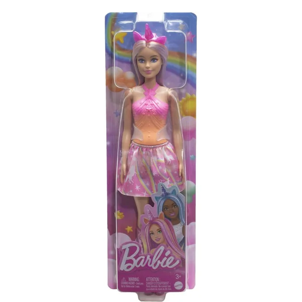 Barbie joue les licornes avec son diadème et une queue de cheval autour de sa taille cintrée. Une jupette et de longues bottes rose complètent sa tenue.