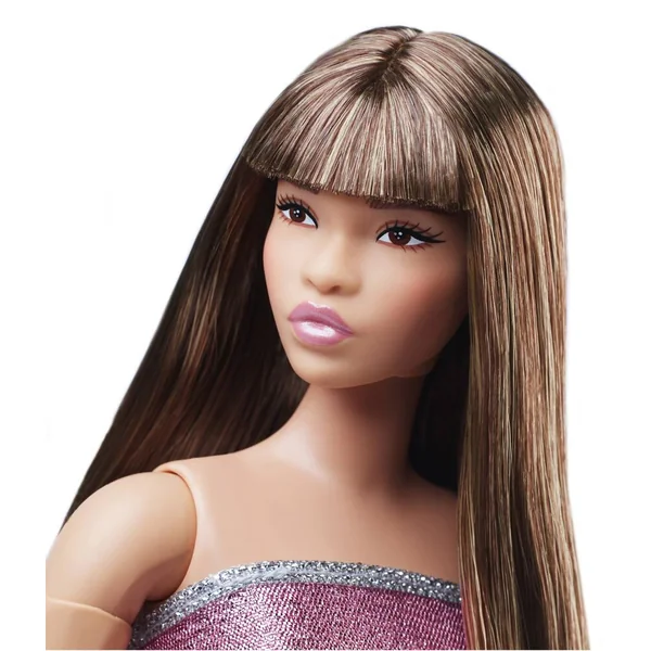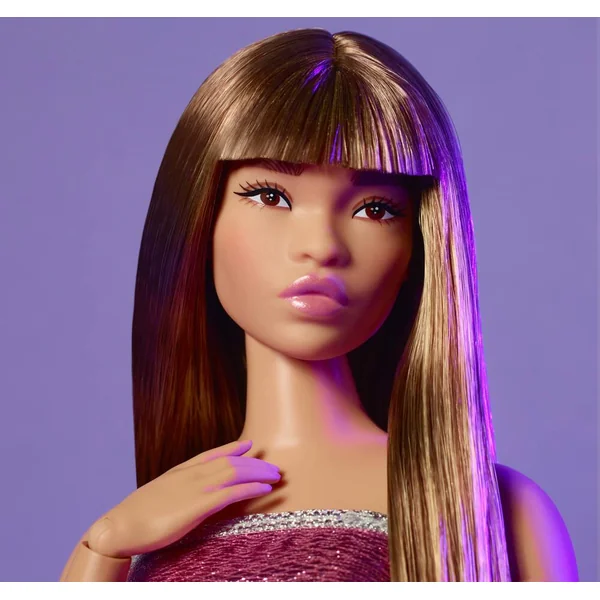 Ses cheveux lisses à franges et sa robe courte de couleur rose donnent à la poupée une allure de baby Doll.