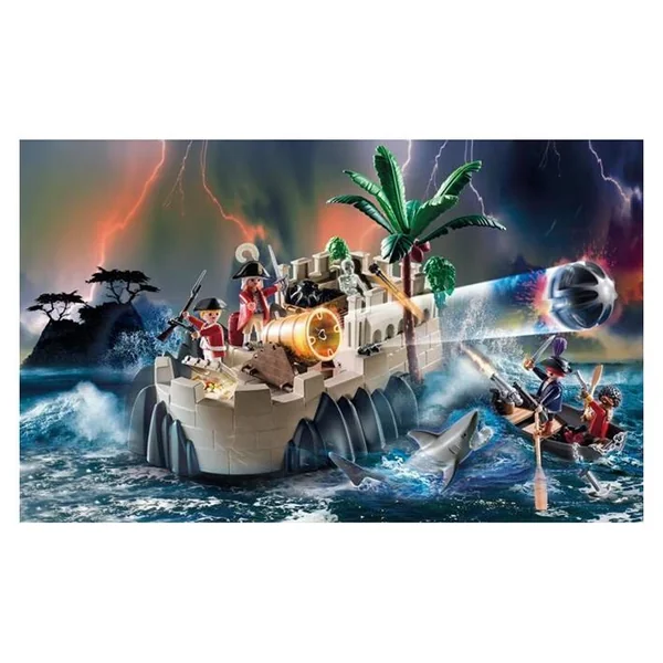 Le royaume est attaqué ! Les soldats montent dans le bastion pour défendre le royaume face aux pirates. Le bastion est équipé d’un gros canon, d’un muret de défense et d’un coffre. Contient 4 personnages, 2 canons différents, 1 requin, 1 squelette et des accessoires (coffre, armes, projectiles…).