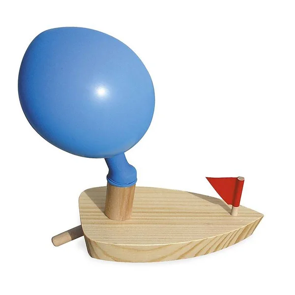 En se dégonflant, le ballon fait avancer le bateau en bois.